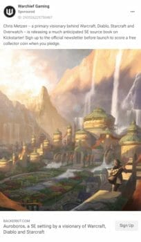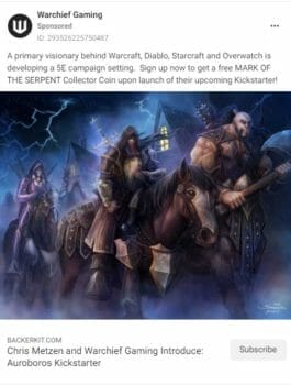 You can see the Auroborus: Coils of the Serpent – A 5E Setting page on BackerKit. It’s added at least 1,000 other people to Warchief’s incoming notes of interest.