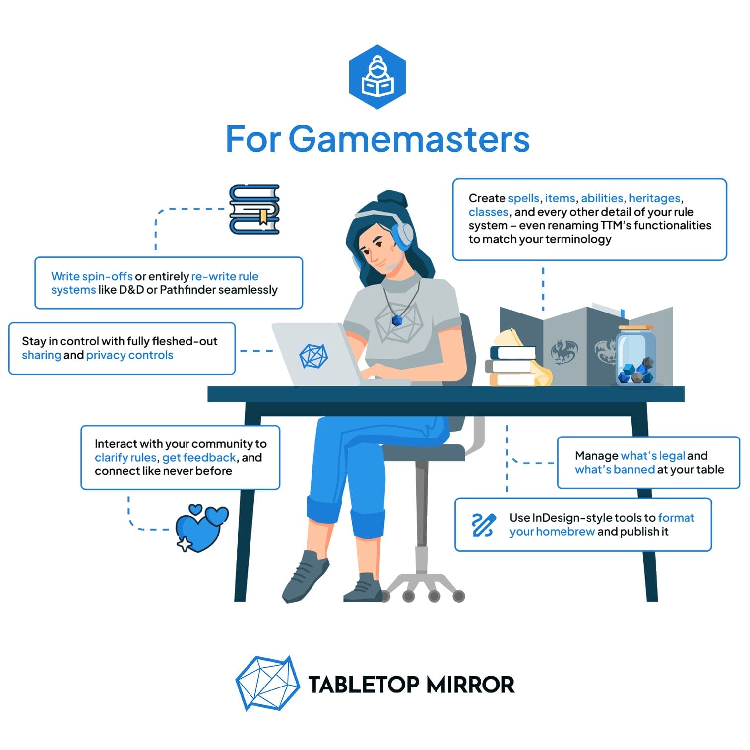 Hedron (formerly Tabletop Mirror) is the premier TTRPG homebrew platform and is truly a one-stop shop for TTRPG homebrew tools. Design and play entirely new TTRPGs, build robust worlds for your home games, and connect with your community – share your lore, worldbuilding, homebrew, and other creations! Hedron gives you all the tools you need to bring your worlds to life, completely customizable, easy-to-use, and with no coding required to bring your stories onto the platform and your game nights to life!