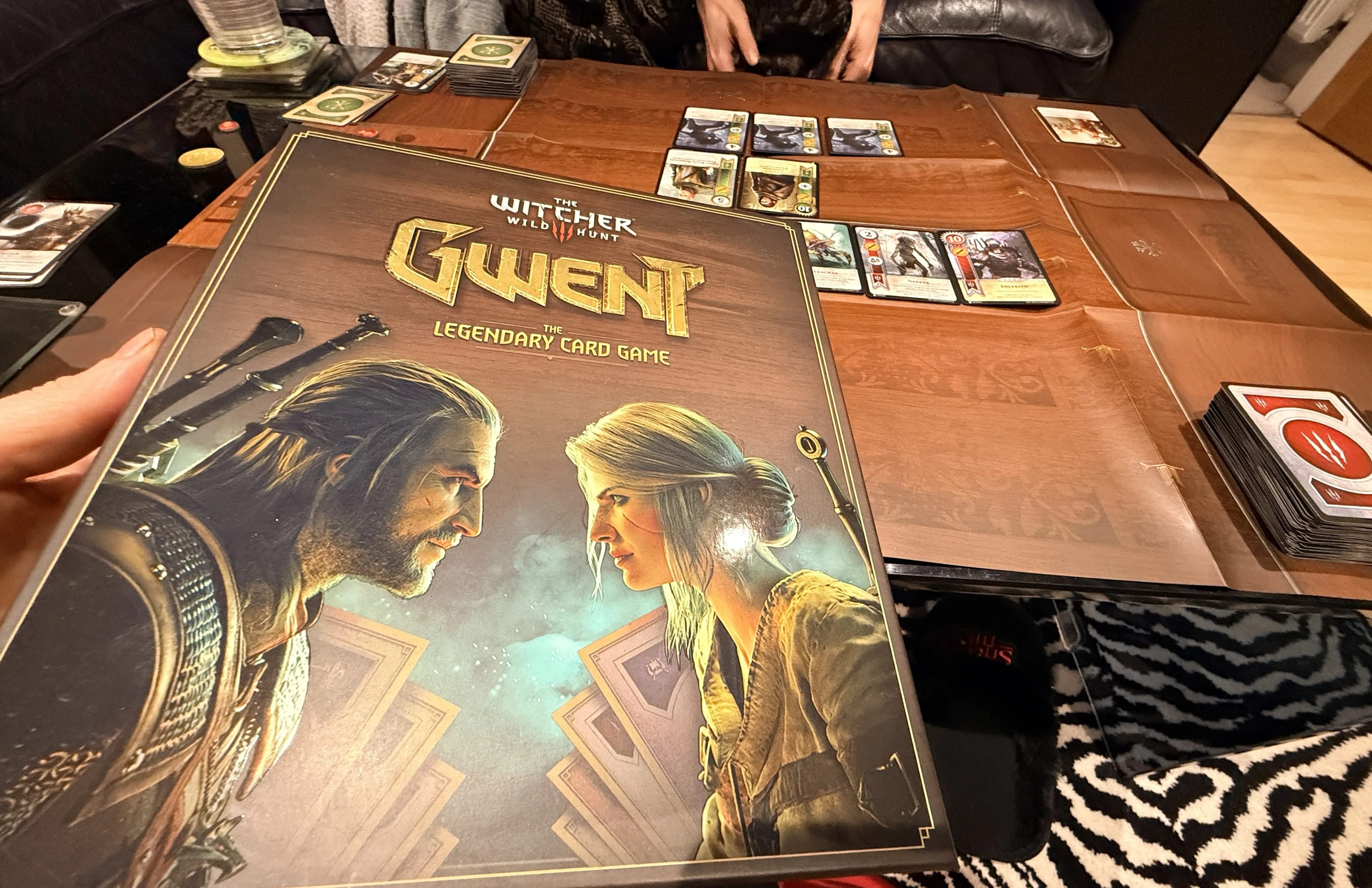 We started by unboxing Gwent, picking out our factions, setting up the board (which as you can see is paper, meaning it’s a little flimsier than one might like – but you don’t actually have to use it if you already know where everything goes), and looking at the awesome cards.