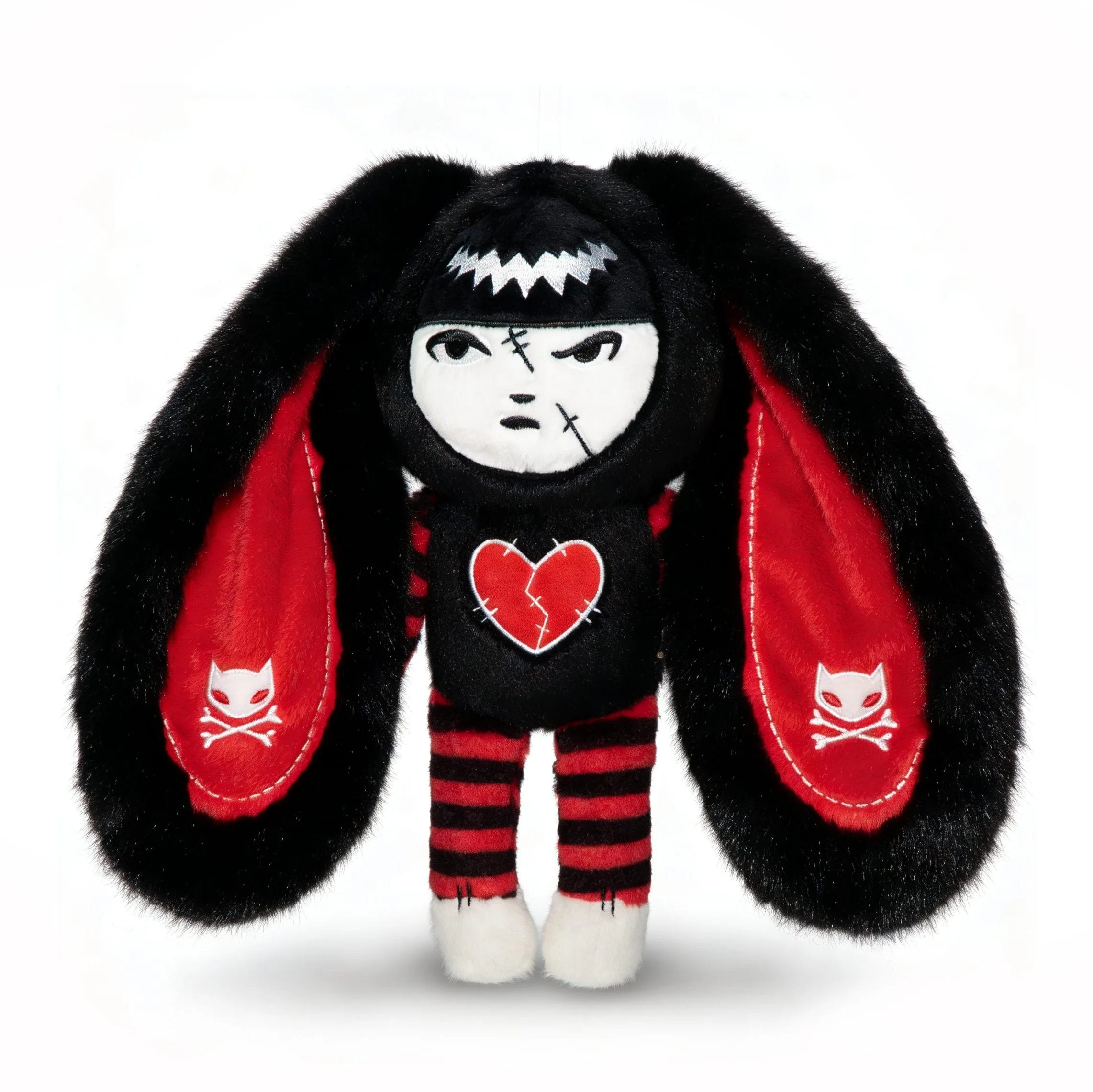 The design itself features Emily in a Plushie Dreadfuls rabbit onesie, adorned with a broken, stitched heart motif and cat skull-and-bones tattoos on the ears. It is a visual shorthand for the “soft goth” aesthetic that both creators helped pioneer – Reger through stickers and t-shirts, and McGee through psychological horror roleplaying games and action titles.
