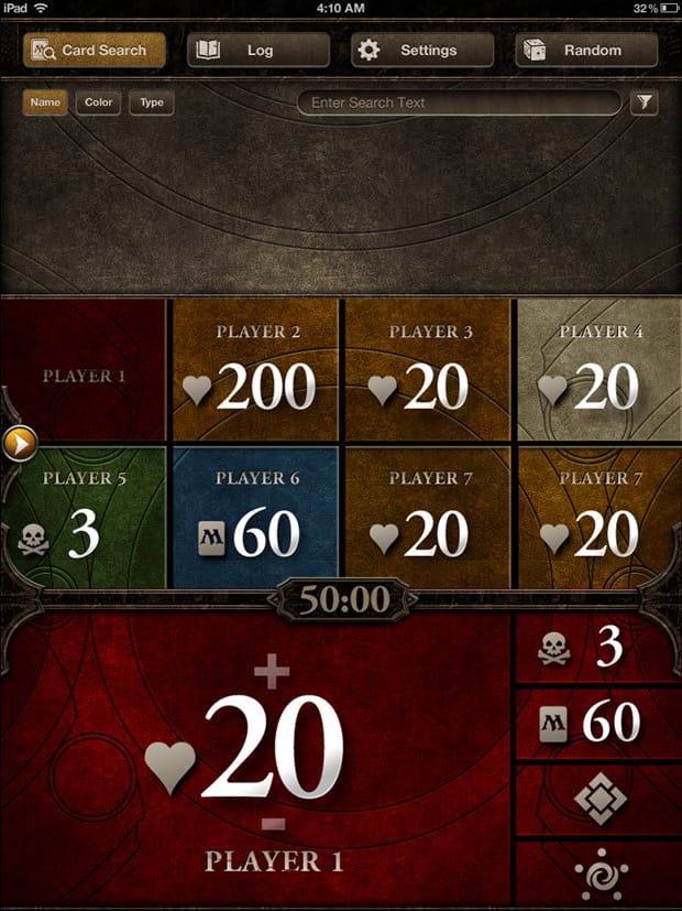 The app goes as far as letting players build decks as well as providing an advanced life counter for players. I rather like how the single screen is used to show the life scores for both players; with the life value correctly oriented for both sides of the table.