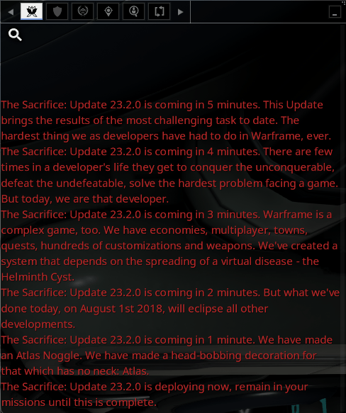 However, as Warframe is a multi-player shooter there’s another consideration. Players might be engaged in missions for those few seconds the servers are busily upgrading from pre-hot patch to the latest edition of the code. Digital Extremes, who run Warframe, don’t want players to log out during that window as they risk loosing their progress.