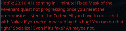 The solution is to tell players that a hot patch is being applied. When Digital Extremes do this ‘red text’ appears in the game.