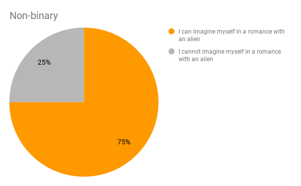 Perhaps it comes as no surprise, but those who took part in the quiz and don’t identify as either male or female seemed to be more open-minded. A full 75% of non-binary respondents could imagine themselves in a romance with an alien.