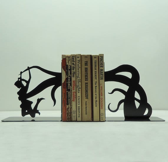 Etsy retailer Knob Creek Metal Arts may have a strange name but their collection of metal bookends are a visual treat. The great thing about clever bookends is that they turn the awkward collection of books on the shelf into a talking point. Geeky bookends transform a pile of books from clutter to art.